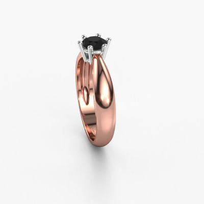 Bovenstaande verlovingsring heeft de naam Fay, dit type verlovingsring noemen we een solitaire ring omdat hij een enkele edelsteen bevat. De verlovingsring is uitgevoerd in 14 Carat rosé goud en heeft een ronde zwarte diamant ter grootte van 0.60 crt. Deze traditionele rosé gouden solitaire ring met een schitterende ronde zwarte diamant is een prachtige verlovingsring. Doordat de chatonzetting open is, is de lichtinval op de edelsteen optimaal. Ook plaatsen we de edelsteen hoog op de ring, waardoor deze extra opvalt. De diamant is bijvoorbeeld een prachtige edelsteen om aan de liefde van je leven te schenken, omdat deze symbool staat voor eeuwige liefde en zuiverheid. En dit symbool straalt midden op deze solitaire ring. Zo heeft iedere edelsteen een mooie symbolische betekenis. Deze solitaire verlovingsring kunt u zelf samenstellen in verschillende edelmetaal combinaties. Deze heeft de combinatie 14 Carat rosé goud met witgoud. Ieder juweel wordt speciaal voor jou gemaakt door onze meester goudsmeden in ons eigen atelier.Door het gebruik van de modernste technieken, gecombineerd met ambachtelijk vakmanschap kunnen wij alle verlovingsringen zelf in ons atelier maken. Ieder sieraad wordt pas gemaakt nadat deze besteld is. Dit heeft als bijkomend voordeel dat we kunnen leveren tegen een prijs die je nergens anders tegenkomt.Heb je zelf een specifieke verlovingsring ergens gezien, die je graag aan jouw geliefde zou willen geven? Bespreek gerust jouw ideeën met onze sieradenontwerpers, want wij zetten graag jouw ontwerp om tot een traditionele verlovingsring. Je kunt tijdens het ontwerpproces steeds meekijken, omdat wij met 3D tekeningen werken. Je krijgt hierdoor al een realistische indruk van hoe jouw ontwerp er in werkelijkheid uit komt te zien. Daarbij kun je een dummy vooraf bestellen. Een dummy is een kunststof ring, die precies dezelfde vormen heeft als jouw uiteindelijke ontwerp. Je kunt deze passen en zien of de breedte en dikte bijvoorbeeld naar wens zijn. Wij sturen je graag een vrijblijvende offerte, waarbij je ongetwijfeld versteld zult staan over de prijs en de kwaliteit van de ring en edelstenen.Om het voor jou makkelijker te maken kun je ieder besteld sieraad binnen 30 dagen na aflevering eenvoudig weer retour sturen.