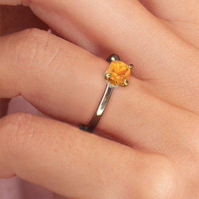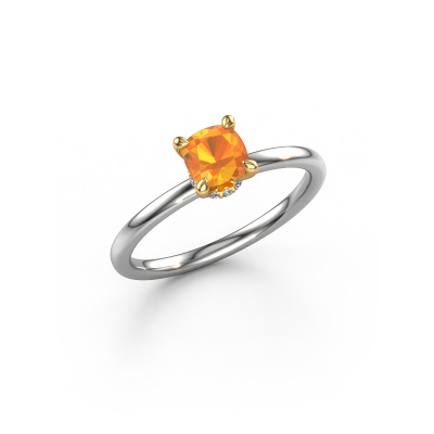 Bovenstaande verlovingsring heeft de naam Crystal CUS 3, dit type verlovingsring noemen we een solitaire ring omdat hij een enkele edelsteen bevat. De verlovingsring is uitgevoerd in 14 Carat witgoud en heeft een cushion citrien ter grootte van 5 mm. Deze modieuze witgouden solitaire ring met een schitterende cushion citrien is een prachtige verlovingsring. Doordat de chatonzetting open is, is de lichtinval op de edelsteen optimaal. Ook plaatsen we de edelsteen hoog op de ring, waardoor deze extra opvalt. De diamant is bijvoorbeeld een prachtige edelsteen om aan de liefde van je leven te schenken, omdat deze symbool staat voor eeuwige liefde en zuiverheid. En dit symbool straalt midden op deze solitaire ring. Zo heeft iedere edelsteen een mooie symbolische betekenis. Deze solitaire verlovingsring kunt u zelf samenstellen in verschillende edelmetaal combinaties. Deze heeft de combinatie 14 Carat witgoud met goud. Ieder juweel is gemaakt door een team van gedreven goudsmeden en designers. Hierdoor zal dit unieke pronkstuk een echte eyecatcher zijn.Door het gebruik van de modernste technieken, gecombineerd met ambachtelijk vakmanschap kunnen wij alle verlovingsringen zelf in ons atelier maken. Ieder sieraad wordt pas gemaakt nadat deze besteld is. Dit heeft als bijkomend voordeel dat we kunnen leveren tegen een prijs die je nergens anders tegenkomt.Iedere dag is ons team van goudsmeden en sieradenontwerpers aan het werk om nieuwe sieraden te creëren. Het kan zijn dat je ergens een modieuze verlovingsring gezien hebt, die je als basis wilt nemen bij het ontwerpen van jouw unieke ring. Neem gerust contact met ons op en we zullen je een aanbod doen, waar je vrijwel zeker verwonderd zult zijn over de kwaliteit en de prijs.Om het voor jou makkelijker te maken kun je ieder besteld sieraad binnen 30 dagen na aflevering eenvoudig weer retour sturen.
