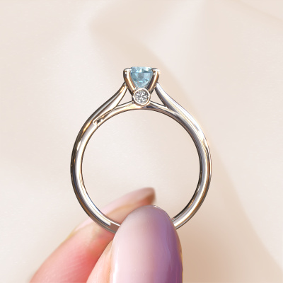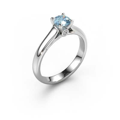 Bovenstaande verlovingsring heeft de naam Valorie RND 1, dit type verlovingsring noemen we een solitaire ring omdat hij een enkele edelsteen bevat. De verlovingsring is uitgevoerd in 14 Carat witgoud en heeft een ronde blauwe lab grown diamant ter grootte van 5 mm. Deze moderne witgouden solitaire ring met een schitterende ronde blauwe lab grown diamant is een prachtige verlovingsring. Doordat de chatonzetting open is, is de lichtinval op de edelsteen optimaal. Ook plaatsen we de edelsteen hoog op de ring, waardoor deze extra opvalt. De diamant is bijvoorbeeld een prachtige edelsteen om aan de liefde van je leven te schenken, omdat deze symbool staat voor eeuwige liefde en zuiverheid. En dit symbool straalt midden op deze solitaire ring. Zo heeft iedere edelsteen een mooie symbolische betekenis. Deze solitaire verlovingsring kunt u zelf samenstellen in verschillende edelmetaal combinaties. Deze heeft de combinatie 14 Carat witgoud met witgoud. Ieder juweel is speciaal voor jou gemaakt, met aandacht voor detail en design.Door onze modernste technieken kunnen wij met uiterste precisie prachtige sieraden te ontwerpen en voor jou personaliseren in de hoogste juwelierskwaliteit. Tegelijkertijd zijn onze verlovingsringen altijd 30% goedkoper dan bij een andere juwelier. Dit komt doordat alle verlovingsringen pas vervaardigd worden op het moment dat deze besteld wordt en we daardoor geen dure voorraden hoeven te hanteren. Mocht je aan een bepaald budget gebonden zijn, kunnen we je graag adviseren welke combinatie je het beste kunt kiezen.Heb je zelf een speciale ring in gedachten, die je wellicht ergens gezien hebt? Je kunt je ideeën altijd met ons bespreken, wij zetten graag jouw ontwerp om tot een unieke verlovingsring. Het ontwerp kun je volgen, omdat wij met 3D tekeningen werken. Hierdoor krijg je al een realistische indruk van hoe jouw ontwerp er in het echt uit komt te zien. Wij sturen je graag een vrijblijvende offerte, waarbij je ongetwijfeld verwonderd zult zijn over de prijs in combinatie met de uitstekende kwaliteit die we aanbieden.Om het voor jou makkelijker te maken kun je ieder besteld sieraad binnen 30 dagen na aflevering eenvoudig weer retour sturen.