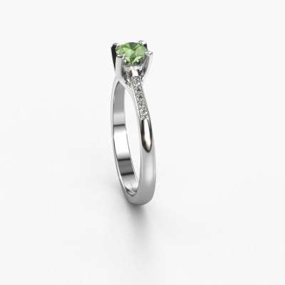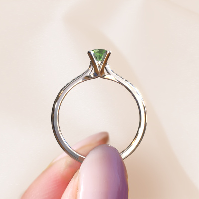 Bovenstaande aanzoeksring heeft de naam Isa 2. Dit type aanzoeksring noemen we een pavé solitaire aanzoeksring omdat hij een enkele middensteen heeft waarbij de banden van de aanzoeksring ook volgezet zijn. Deze aanzoeksring is uitgevoerd in 14 Carat witgoud en heeft als middensteen een ronde toermalijn groen ter grootte van 4.2 mm, en in de zijbanden zijn diamanten gezet. Ieder juweel is gemaakt om aan je vinger te stralen, ieder sieraad wordt met liefde door onze goudsmeden met de hand gemaakt.. Deze klassieke witgouden pavé solitaire aanzoeksring heeft een schitterende ronde toermalijn groen als center steen, waarbij in de band nog meer diamanten zijn gezet om de middensteen nog meer te accentueren. Doordat de zetting van de pootjes om de toermalijn groen open is, vangt de toermalijn groen het licht van alle kanten op en schittert hierdoor optimaal. Hierboven kun je zien hoe onze goudsmid de aanzoeksring heel precies tot in de kleinste details heeft bewerkt, zodat de wat hoger gelegen toermalijn groen een echte eyecatcher is. Wat een prachtige aanzoeksring om te geven bij je aanzoek aan de liefde van jouw leven, aan jouw stralende middelpunt!Wist je dat we een beste prijs garantie geven voor jouw aanzoeksring? Dit is mogelijk omdat al onze sieraden met de hand gemaakt worden in ons eigen atelier. We hebben geen dure voorraden, en we maken pas je aanzoeksring op het moment dat je besteld hebt. Doordat we de hele productie zelf in de hand hebben, kunnen wij je goed informeren over alle eigenschappen van deze ring. Juist omdat het kopen van een aanzoeksring online spannend is, begrijpen wij dat het fijn is om alle kenmerken te weten van jouw ring.Ons team ontwerpt dagelijks nieuwe ringen in diverse stijlen. Heb je zelf een pavé solitaire aanzoeksring ergens gezien, die jij het liefst aan jouw geliefde zou willen geven? Je kunt altijd jouw ideeën en ontwerp met onze sieradenontwerpers bespreken, want wij zetten graag jouw ontwerp om tot een klassieke aanzoeksring. Je kunt tijdens het ontwerpproces steeds meekijken, omdat het ontwerp in een zeer gedetailleerde 3D tekening wordt omgezet. Daarbij kun je een dummy bestellen van het uiteindelijke ontwerp. Een dummy is een kunststof ring, die precies dezelfde vormen heeft als jouw uiteindelijke ontwerp. Je kunt deze passen en zien of de ontworpen aanzoeksring helemaal naar jouw wens is. Wij sturen je graag een vrijblijvende offerte, waarbij je ongetwijfeld versteld zult staan over de prijs en de kwaliteit van de ring en edelstenen.Om het voor jou makkelijker te maken kun je ieder besteld sieraad binnen 30 dagen na aflevering eenvoudig weer retour sturen.