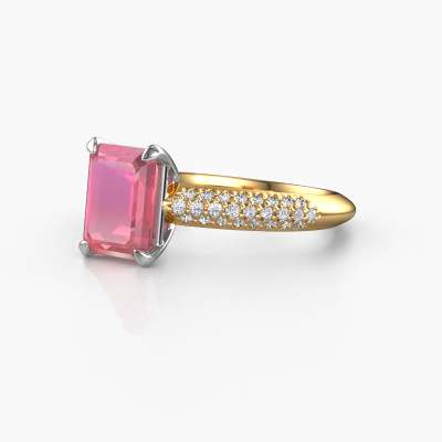 Bovenstaande verlovingsring heeft de naam Morane EME. Dit type verlovingsring noemen we een pavé solitaire verlovingsring omdat hij een enkele middensteen heeft waarbij de banden van de verlovingsring ook volgezet zijn. De verlovingsring is uitgevoerd in de combinatie 14 Carat goud met witgoud en heeft als middensteen een smaragd geslepen toermalijn pink ter grootte van 8x6 mm en in de zijbanden zijn lab-grown diamanten gezet. Ieder juweel wordt speciaal voor jou gemaakt door onze meester goudsmeden in ons eigen atelier.Deze unieke gouden pavé solitaire verlovingsring heeft een schitterende smaragd geslepen toermalijn pink als centersteen, waarbij in de band nog meer toermalijn pink zijn gezet om de middensteen nog meer te accentueren. Doordat de zetting van de pootjes om de toermalijn pink open is, vangt de toermalijn pink het licht van alle kanten op en schittert hierdoor optimaal. Hierboven kun je zien hoe onze goudsmid de verlovingsring heel precies tot in de kleinste details heeft bewerkt, zodat de wat hoger gelegen toermalijn pink een echte eyecatcher is. Wat een prachtige verlovingsring om te geven bij je aanzoek aan de liefde van jouw leven, aan jouw stralende middelpunt!Wist je dat we een beste prijs garantie geven voor jouw verlovingsring? Dit is mogelijk omdat al onze sieraden met de hand gemaakt worden in ons eigen atelier. We hebben geen dure voorraden, en we maken pas je verlovingsring op het moment dat je besteld hebt. Doordat we de hele productie zelf in de hand hebben, kunnen wij je goed informeren over alle eigenschappen van deze ring. Juist omdat het kopen van een verlovingsring online spannend is, begrijpen wij dat het fijn is om alle kenmerken te weten van jouw ring.Ons team is iedere dag weer bezig om nieuwe ontwerpen toe te voegen, in samenwerking met onze designers en goudsmeden wordt gekeken hoe we tot het mooiste ontwerp kunnen komen. Wij doen ons best om tot een zo gevarieerd mogelijk aanbod te komen. Wellicht heb je zelf al een mooi idee van een sieraad dat je ooit wel eens gezien hebt. Neem dan eens vrijblijvend contact met ons op. Wij maken een offerte voor je op waarbij wij vrij zeker zijn dat we wat betreft kwaliteit en prijs jou versteld zullen laten staan.Om het voor jou makkelijker te maken kun je ieder besteld sieraad binnen 30 dagen na aflevering eenvoudig weer retour sturen.