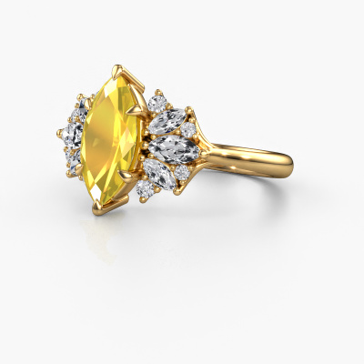 De naam van deze verlovingsring is de Jaimie. Hij is gemaakt van 14 Carat goud en gezet met een 12x6 mm gele saffier. Zoek je een unieke gouden verlovingsring, die je zelf naar jouw smaak kunt aanpassen? In deze unieke verlovingsring is gele saffier verwerkt. Deze zijn zorgvuldig geselecteerd om het mooiste effect te creëren. Onze goudsmid vervaardigt jouw verlovingsring beneden in ons eigen atelier, en plaatst de gele saffier met uiterste precisie in de ring. Vervolgens wordt deze bijgewerkt en gepolijst totdat het resultaat zichtbaar is: de perfecte verlovingsring voor de liefde van jouw leven! Dit juweel wordt speciaal voor jou gemaakt door onze meester goudsmeden in ons eigen atelier.Door het gebruik van de modernste technieken, gecombineerd met ambachtelijk vakmanschap kunnen wij alle verlovingsringen zelf in ons atelier maken. Ieder sieraad wordt pas gemaakt nadat deze besteld is. Dit heeft als bijkomend voordeel dat we kunnen leveren tegen een prijs die je nergens anders tegenkomt.Heb je zelf een specifieke verlovingsring ergens gezien, die je graag aan jouw geliefde zou willen geven? Bespreek gerust jouw ideeën met onze sieradenontwerpers, want wij zetten graag jouw ontwerp om tot een unieke verlovingsring. Je kunt tijdens het ontwerpproces steeds meekijken, omdat wij met 3D tekeningen werken. Je krijgt hierdoor al een realistische indruk van hoe jouw ontwerp er in werkelijkheid uit komt te zien. Daarbij kun je een dummy vooraf bestellen. Een dummy is een kunststof ring, die precies dezelfde vormen heeft als jouw uiteindelijke ontwerp. Je kunt deze passen en zien of de breedte en dikte bijvoorbeeld naar wens zijn. Wij sturen je graag een vrijblijvende offerte, waarbij je ongetwijfeld versteld zult staan over de prijs en de kwaliteit van de ring en edelstenen.Om het voor jou makkelijker te maken kun je ieder besteld sieraad binnen 30 dagen na aflevering eenvoudig weer retour sturen.