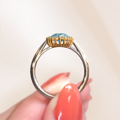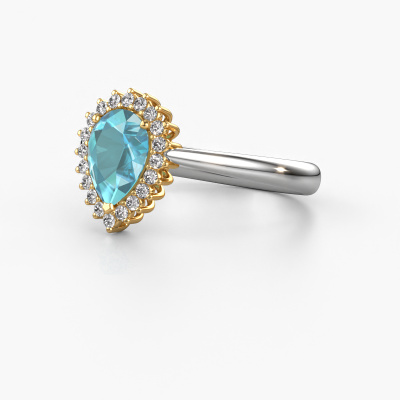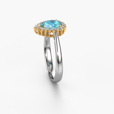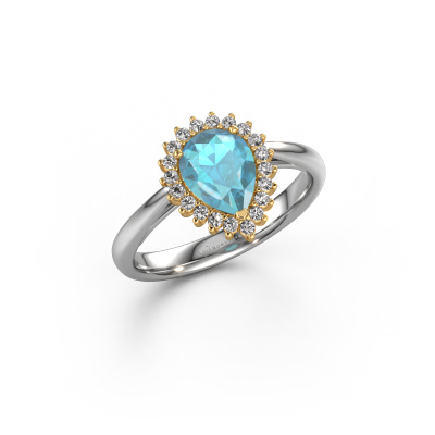 Bovenstaande verlovingsring heeft de naam Tilly per 1. Dit type verlovingsring noemen we een entourage ring, hierbij worden rondom de middensteen in een open zetting allemaal kleine edelstenen gezet. Deze verlovingsring uitgevoerd in 14 Carat witgoud heeft een peer blauw topaas van 8x6 mm als center steen met daaromheen kleine diamanten. Het opvallende aan deze exclusieve witgouden entourage verlovingsring is de vorm: de kleine edelstenen vormen samen met de blauw topaas een prachtige bloem, die lijkt samen te smelten tot één fonkelende edelsteen. Deze verlovingsring wordt ook wel de flower of de rozet verlovingsring genoemd. Onze meestergoudsmeden zorgen ervoor dat de kleinere diamanten allen op dezelfde manier geplaatst worden, zodat het licht niet onderbroken wordt in de blauw topaas en er inderdaad een prachtige eenheid gecreëerd wordt. Met een geoefend oog en een vaardige hand wordt iedere zorgvuldig geselecteerde blauw topaas in de verlovingsring geplaatst. Steeds opnieuw wordt de verlovingsring onder de loep gehouden om te zien of het speciale effect nog steeds zichtbaar is. Het resultaat is een unieke verlovingsring, waarbij de gekozen blauw topaas letterlijk het stralende middelpunt wordt. Wat een prachtige, betekenisvolle verlovingsring om te geven aan het stralende middelpunt in jouw leven! Onze goudsmeden vervaardigen pas je Tilly per 1 verlovingsring, zodra je deze besteld hebt. We hebben geen voorraden. Het voordeel hiervan is dat we de voorraad niet door hoeven te berekenen in de prijs, en kunnen daardoor sieraden leveren tegen een bijzonder lage prijs.Ons team is iedere dag weer bezig om nieuwe ontwerpen toe te voegen, in samenwerking met onze designers en goudsmeden wordt gekeken hoe we tot het mooiste ontwerp kunnen komen. Wij doen ons best om tot een zo gevarieerd mogelijk aanbod te komen. Wellicht heb je zelf al een mooi idee van een sieraad dat je ooit wel eens gezien hebt. Neem dan eens vrijblijvend contact met ons op. Wij maken een offerte voor je op waarbij wij vrij zeker zijn dat we wat betreft kwaliteit en prijs jou versteld zullen laten staan.Om het voor jou makkelijker te maken kun je ieder besteld sieraad binnen 30 dagen na aflevering eenvoudig weer retour sturen.