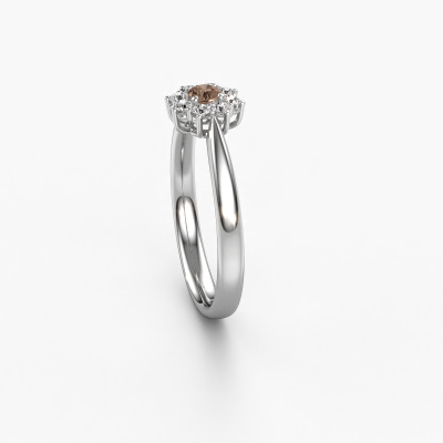 Bovenstaande verlovingsring heeft de naam Carolyn 1. Dit type verlovingsring noemen we een entourage ring, hierbij worden rondom de middensteen in een open zetting allemaal kleine edelstenen gezet. Deze verlovingsring uitgevoerd in 14 Carat witgoud heeft een ronde bruine diamant van 0.10 crt als center steen met daaromheen kleine diamanten. Het opvallende aan deze traditionele witgouden flower verlovingsring is de vorm: de kleine edelstenen vormen samen met de bruine diamant een prachtige bloem, die lijkt samen te smelten tot één fonkelende edelsteen. Deze verlovingsring wordt ook wel de flower of de rozet verlovingsring genoemd. Onze meestergoudsmeden zorgen ervoor dat de kleinere diamanten allen op dezelfde manier geplaatst worden, zodat het licht niet onderbroken wordt in de bruine diamant en er inderdaad een prachtige eenheid gecreëerd wordt. Met een geoefend oog en een vaardige hand wordt iedere zorgvuldig geselecteerde bruine diamant in de verlovingsring geplaatst. Steeds opnieuw wordt de verlovingsring onder de loep gehouden om te zien of het speciale effect nog steeds zichtbaar is. Het resultaat is een unieke verlovingsring, waarbij de gekozen bruine diamant letterlijk het stralende middelpunt wordt. Wat een prachtige, betekenisvolle verlovingsring om te geven aan het stralende middelpunt in jouw leven! Door onze modernste technieken kunnen wij met uiterste precisie prachtige sieraden te ontwerpen en voor jou personaliseren in de hoogste juwelierskwaliteit. Tegelijkertijd zijn onze verlovingsringen altijd 30% goedkoper dan bij een andere juwelier. Dit komt doordat alle verlovingsringen pas vervaardigd worden op het moment dat deze besteld wordt en we daardoor geen dure voorraden hoeven te hanteren. Mocht je aan een bepaald budget gebonden zijn, kunnen we je graag adviseren welke combinatie je het beste kunt kiezen.Heb je zelf een speciale ring in gedachten, die je wellicht ergens gezien hebt? Je kunt je ideeën altijd met ons bespreken, wij zetten graag jouw ontwerp om tot een unieke verlovingsring. Het ontwerp kun je volgen, omdat wij met 3D tekeningen werken. Hierdoor krijg je al een realistische indruk van hoe jouw ontwerp er in het echt uit komt te zien. Wij sturen je graag een vrijblijvende offerte, waarbij je ongetwijfeld verwonderd zult zijn over de prijs in combinatie met de uitstekende kwaliteit die we aanbieden.Om het voor jou makkelijker te maken kun je ieder besteld sieraad binnen 30 dagen na aflevering eenvoudig weer retour sturen.