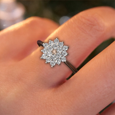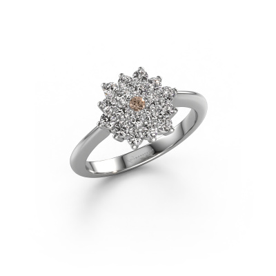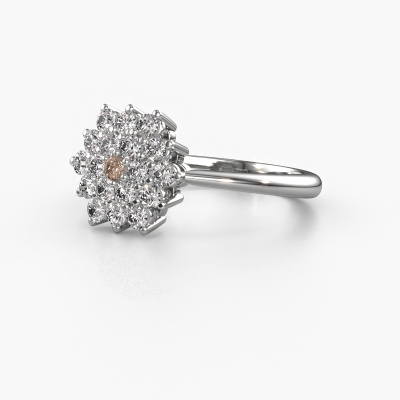 Bovenstaande verlovingsring heeft de naam Vickey. Dit type verlovingsring noemen we een entourage ring, hierbij worden rondom de middensteen in een open zetting allemaal kleine edelstenen gezet. Deze verlovingsring uitgevoerd in 14 Carat witgoud heeft een ronde bruine diamant van 0.03 crt als center steen met daaromheen kleine diamanten. Het opvallende aan deze klassieke witgouden rozet verlovingsring is de vorm: de kleine edelstenen vormen samen met de bruine diamant een prachtige bloem, die lijkt samen te smelten tot één fonkelende edelsteen. Deze verlovingsring wordt ook wel de flower of de rozet verlovingsring genoemd. Onze meestergoudsmeden zorgen ervoor dat de kleinere diamanten allen op dezelfde manier geplaatst worden, zodat het licht niet onderbroken wordt in de bruine diamant en er inderdaad een prachtige eenheid gecreëerd wordt. Met een geoefend oog en een vaardige hand wordt iedere zorgvuldig geselecteerde bruine diamant in de verlovingsring geplaatst. Steeds opnieuw wordt de verlovingsring onder de loep gehouden om te zien of het speciale effect nog steeds zichtbaar is. Het resultaat is een unieke verlovingsring, waarbij de gekozen bruine diamant letterlijk het stralende middelpunt wordt. Wat een prachtige, betekenisvolle verlovingsring om te geven aan het stralende middelpunt in jouw leven! Omdat wij zelf alle verlovingsring maken en direct aan jou leveren kunnen wij je een verlovingsring leveren tegen een prijs die je nergens anders zult tegenkomen. Een ring wordt pas gemaakt als we een bestelling krijgen, hierdoor hebben wij geen dure voorraden en kunnen wij je de beste prijs garanderen. Wij begrijpen dat het kopen van een verlovingsring online spannend is en willen daarom je zoveel mogelijk informeren over alle specifieke eigenschappen van de ring die jij koopt.Iedere dag is ons team van goudsmeden en sieradenontwerpers aan het werk om nieuwe sieraden te creëren. Het kan zijn dat je ergens een klassieke verlovingsring gezien hebt, die je als basis wilt nemen bij het ontwerpen van jouw unieke ring. Neem gerust contact met ons op en we zullen je een aanbod doen, waar je vrijwel zeker verwonderd zult zijn over de kwaliteit en de prijs.Om het voor jou makkelijker te maken kun je ieder besteld sieraad binnen 30 dagen na aflevering eenvoudig weer retour sturen.