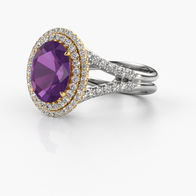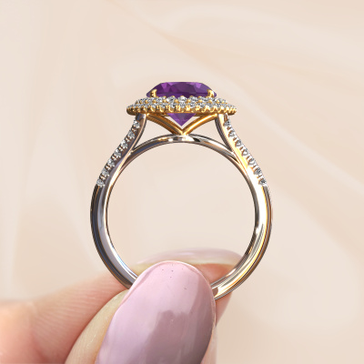 Bovenstaande verlovingsring heeft de naam Elvie. Dit type verlovingsring noemen we een halo ring. De verlovingsring is uitgevoerd in 14 Carat witgoud en heeft als middensteen een ovale amethist ter grootte van 10x8 mm en eromheen zijn kleine lab-grown diamanten gezet. Het bijzondere van deze vintage witgouden pavé solitaire verlovingsring zijn de kleinere edelstenen die rondom de grote amethist zijn gezet. Dat is ook waar deze mooie verlovingsring zijn naam door heeft gekregen: pavé solitaire betekent lichtkrans en dat is ook waar de kleinere edelstenen voor zorgen. Deze kleinere edelstenen moeten dan echter wel allen op dezelfde manier geplaatst zijn, zodat het licht niet doorbroken wordt in de amethist en er inderdaad een prachtige lichtkrans gecreëerd wordt. En daar zorgen onze meestergoudsmeden voor. Met uiterste precisie wordt iedere zorgvuldig geselecteerde amethist met de hand in de verlovingsring geplaatst. Steeds opnieuw wordt de verlovingsring tegen het licht gehouden om te zien of het speciale effect nog steeds zichtbaar is. Het resultaat is een unieke verlovingsring, waarbij de gekozen amethist letterlijk het stralende middelpunt wordt. Je kunt je voorstellen dat deze verlovingsring werkelijk een betekenisvolle verlovingsring is om aan jouw liefde voor het leven te schenken! Op de dag dat jij laat zien dat zij jouw stralende middelpunt is!Door onze modernste technieken kunnen wij met uiterste precisie prachtige sieraden te ontwerpen en voor jou personaliseren in de hoogste juwelierskwaliteit. Tegelijkertijd zijn onze verlovingsringen altijd 30% goedkoper dan bij een andere juwelier. Dit komt doordat alle verlovingsringen pas vervaardigd worden op het moment dat deze besteld wordt en we daardoor geen dure voorraden hoeven te hanteren. Mocht je aan een bepaald budget gebonden zijn, kunnen we je graag adviseren welke combinatie je het beste kunt kiezen.Heb je zelf een speciale ring in gedachten, die je wellicht ergens gezien hebt? Je kunt je ideeën altijd met ons bespreken, wij zetten graag jouw ontwerp om tot een unieke verlovingsring. Het ontwerp kun je volgen, omdat wij met 3D tekeningen werken. Hierdoor krijg je al een realistische indruk van hoe jouw ontwerp er in het echt uit komt te zien. Wij sturen je graag een vrijblijvende offerte, waarbij je ongetwijfeld verwonderd zult zijn over de prijs in combinatie met de uitstekende kwaliteit die we aanbieden.Om het voor jou makkelijker te maken kun je ieder besteld sieraad binnen 30 dagen na aflevering eenvoudig weer retour sturen.