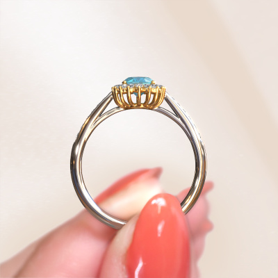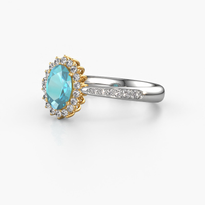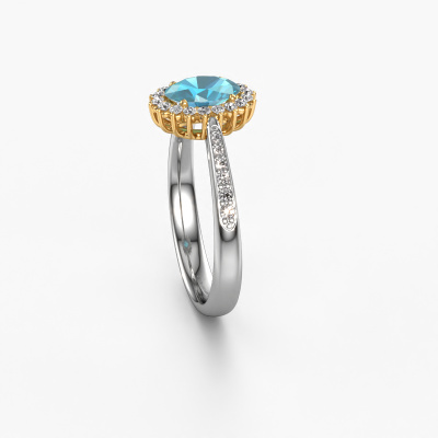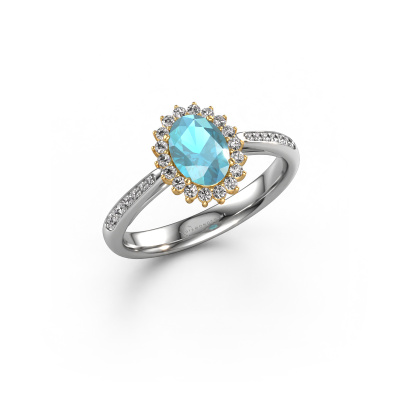 Bovenstaande verlovingsring heeft de naam Tilly ovl 2. Dit type verlovingsring noemen we een entourage ring, hierbij worden rondom de middensteen in een open zetting allemaal kleine edelstenen gezet. Deze verlovingsring uitgevoerd in 14 Carat witgoud heeft een ovale blauw topaas van 7x5 mm als center steen met daaromheen kleine lab-grown diamanten. Als je naar deze witgouden entourage verlovingsring kijkt, krijg je het idee dat de kleinere edelstenen samen met de grote blauw topaas tot één grote fonkelende edelsteen samensmelten, in de vorm van een prachtige bloem. Een andere naam voor deze klassieke verlovingsring is hierdoor ook wel de flower of de rozet ring. Deze kleinere lab-grown diamanten moeten dan echter wel allen op eenzelfde manier geplaatst zijn, zodat het licht in de blauw topaas niet onderbroken wordt en er inderdaad een prachtige eenheid gecreëerd wordt. En daar zorgen onze meestergoudsmeden voor. Met uiterste precisie wordt iedere zorgvuldig geselecteerde blauw topaas met de hand in de verlovingsring geplaatst. Steeds opnieuw wordt de verlovingsring onder de loep gehouden om te zien of het speciale effect nog steeds zichtbaar is. Door onze modernste technieken kunnen wij met uiterste precisie prachtige sieraden te ontwerpen en voor jou personaliseren in de hoogste juwelierskwaliteit. Tegelijkertijd zijn onze verlovingsringen altijd 30% goedkoper dan bij een andere juwelier. Dit komt doordat alle verlovingsringen pas vervaardigd worden op het moment dat deze besteld wordt en we daardoor geen dure voorraden hoeven te hanteren. Mocht je aan een bepaald budget gebonden zijn, kunnen we je graag adviseren welke combinatie je het beste kunt kiezen.Ons team ontwerpt dagelijks nieuwe ringen in diverse stijlen. Heb je zelf een entourage verlovingsring ergens gezien, die jij het liefst aan jouw geliefde zou willen geven? Je kunt altijd jouw ideeën en ontwerp met onze sieradenontwerpers bespreken, want wij zetten graag jouw ontwerp om tot een klassieke verlovingsring. Je kunt tijdens het ontwerpproces steeds meekijken, omdat het ontwerp in een zeer gedetailleerde 3D tekening wordt omgezet. Daarbij kun je een dummy bestellen van het uiteindelijke ontwerp. Een dummy is een kunststof ring, die precies dezelfde vormen heeft als jouw uiteindelijke ontwerp. Je kunt deze passen en zien of de ontworpen verlovingsring helemaal naar jouw wens is. Wij sturen je graag een vrijblijvende offerte, waarbij je ongetwijfeld versteld zult staan over de prijs en de kwaliteit van de ring en edelstenen.Om het voor jou makkelijker te maken kun je ieder besteld sieraad binnen 30 dagen na aflevering eenvoudig weer retour sturen.