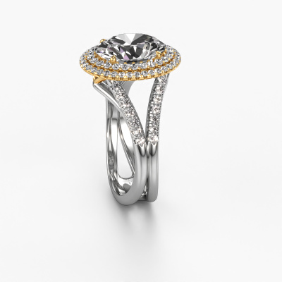 Bovenstaande verlovingsring heeft de naam Elvie. Dit type verlovingsring noemen we een halo ring. De verlovingsring is uitgevoerd in 14 Carat witgoud en heeft als middensteen een ovale zirkonia ter grootte van 10x8 mm en eromheen zijn kleine lab-grown diamanten gezet. Het bijzondere van deze vintage witgouden pavé solitaire verlovingsring zijn de kleinere edelstenen die rondom de grote zirkonia zijn gezet. Dat is ook waar deze mooie verlovingsring zijn naam door heeft gekregen: pavé solitaire betekent lichtkrans en dat is ook waar de kleinere edelstenen voor zorgen. Deze kleinere edelstenen moeten dan echter wel allen op dezelfde manier geplaatst zijn, zodat het licht niet doorbroken wordt in de zirkonia en er inderdaad een prachtige lichtkrans gecreëerd wordt. En daar zorgen onze meestergoudsmeden voor. Met uiterste precisie wordt iedere zorgvuldig geselecteerde zirkonia met de hand in de verlovingsring geplaatst. Steeds opnieuw wordt de verlovingsring tegen het licht gehouden om te zien of het speciale effect nog steeds zichtbaar is. Het resultaat is een unieke verlovingsring, waarbij de gekozen zirkonia letterlijk het stralende middelpunt wordt. Je kunt je voorstellen dat deze verlovingsring werkelijk een betekenisvolle verlovingsring is om aan jouw liefde voor het leven te schenken! Op de dag dat jij laat zien dat zij jouw stralende middelpunt is!Door onze modernste technieken kunnen wij met uiterste precisie prachtige sieraden te ontwerpen en voor jou personaliseren in de hoogste juwelierskwaliteit. Tegelijkertijd zijn onze verlovingsringen altijd 30% goedkoper dan bij een andere juwelier. Dit komt doordat alle verlovingsringen pas vervaardigd worden op het moment dat deze besteld wordt en we daardoor geen dure voorraden hoeven te hanteren. Mocht je aan een bepaald budget gebonden zijn, kunnen we je graag adviseren welke combinatie je het beste kunt kiezen.Heb je zelf een speciale ring in gedachten, die je wellicht ergens gezien hebt? Je kunt je ideeën altijd met ons bespreken, wij zetten graag jouw ontwerp om tot een unieke verlovingsring. Het ontwerp kun je volgen, omdat wij met 3D tekeningen werken. Hierdoor krijg je al een realistische indruk van hoe jouw ontwerp er in het echt uit komt te zien. Wij sturen je graag een vrijblijvende offerte, waarbij je ongetwijfeld verwonderd zult zijn over de prijs in combinatie met de uitstekende kwaliteit die we aanbieden.Om het voor jou makkelijker te maken kun je ieder besteld sieraad binnen 30 dagen na aflevering eenvoudig weer retour sturen.