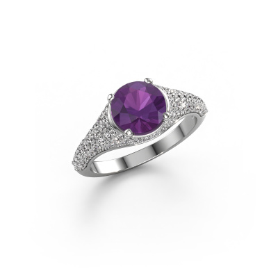 De naam van deze verlovingsring is de Lovella. Hij is gemaakt van 14 Carat witgoud en gezet met 7 mm amethist. Houdt je vriendin van accessoires met een exclusieve uitstraling? Of wil jij haar graag laten zien dat zij alleen het mooiste juweel verdient? In deze witgouden verlovingsring smelten ambachtelijk vakmanschap, liefde en passie samen met de modernste technieken. Het vraagt een geoefend oog, geduld en een vaardige hand om deze verlovingsring tot in de kleinste details perfect samen te stellen. Maar daar gaan onze goudsmeden dan ook absoluut voor! De zetting van deze zorgvuldig geselecteerde amethisten geeft de witgouden micropavé verlovingsring extra allure. De stijl kun je verder aanpassen naar de smaak van jouw vriendin, door een keuze uit diverse edelmetalen en edelstenen. Op die manier creëer jij een unieke verlovingsring voor de meest exclusieve vrouw in jouw leven! Dit juweel is speciaal voor jou gemaakt, met aandacht voor detail en design.Door het gebruik van de modernste technieken, gecombineerd met ambachtelijk vakmanschap kunnen wij alle verlovingsringen zelf in ons atelier maken. Ieder sieraad wordt pas gemaakt nadat deze besteld is. Dit heeft als bijkomend voordeel dat we kunnen leveren tegen een prijs die je nergens anders tegenkomt.Ons team is iedere dag weer bezig om nieuwe ontwerpen toe te voegen, in samenwerking met onze designers en goudsmeden wordt gekeken hoe we tot het mooiste ontwerp kunnen komen. Wij doen ons best om tot een zo gevarieerd mogelijk aanbod te komen. Wellicht heb je zelf al een mooi idee van een sieraad dat je ooit wel eens gezien hebt. Neem dan eens vrijblijvend contact met ons op. Wij maken een offerte voor je op waarbij wij vrij zeker zijn dat we wat betreft kwaliteit en prijs jou versteld zullen laten staan.Om het voor jou makkelijker te maken kun je ieder besteld sieraad binnen 30 dagen na aflevering eenvoudig weer retour sturen.
