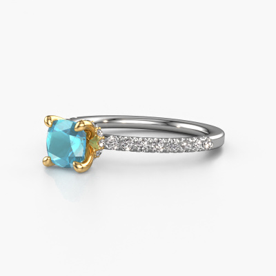 Bovenstaande verlovingsring heeft de naam Crystal CUS 4. Dit type verlovingsring noemen we een pavé solitaire verlovingsring omdat hij een enkele middensteen heeft waarbij de banden van de verlovingsring ook volgezet zijn. De verlovingsring is uitgevoerd in de combinatie 14 Carat witgoud met goud en heeft als middensteen een cushion blauw topaas ter grootte van 5.5 mm en in de zijbanden zijn diamanten gezet. Ieder juweel is gemaakt om aan je vinger te stralen, ieder sieraad wordt met liefde door onze goudsmeden met de hand gemaakt.Deze chique witgouden pavé solitaire verlovingsring heeft een schitterende cushion blauw topaas als centersteen, waarbij in de band nog meer blauw topaas zijn gezet om de middensteen nog meer te accentueren. Doordat de zetting van de pootjes om de blauw topaas open is, vangt de blauw topaas het licht van alle kanten op en schittert hierdoor optimaal. Hierboven kun je zien hoe onze goudsmid de verlovingsring heel precies tot in de kleinste details heeft bewerkt, zodat de wat hoger gelegen blauw topaas een echte eyecatcher is. Wat een prachtige verlovingsring om te geven bij je aanzoek aan de liefde van jouw leven, aan jouw stralende middelpunt!Door onze modernste technieken kunnen wij met uiterste precisie prachtige sieraden te ontwerpen en voor jou personaliseren in de hoogste juwelierskwaliteit. Tegelijkertijd zijn onze verlovingsringen altijd 30% goedkoper dan bij een andere juwelier. Dit komt doordat alle verlovingsringen pas vervaardigd worden op het moment dat deze besteld wordt en we daardoor geen dure voorraden hoeven te hanteren. Mocht je aan een bepaald budget gebonden zijn, kunnen we je graag adviseren welke combinatie je het beste kunt kiezen.Heb je zelf een speciale ring in gedachten, die je wellicht ergens gezien hebt? Je kunt je ideeën altijd met ons bespreken, wij zetten graag jouw ontwerp om tot een unieke verlovingsring. Het ontwerp kun je volgen, omdat wij met 3D tekeningen werken. Hierdoor krijg je al een realistische indruk van hoe jouw ontwerp er in het echt uit komt te zien. Wij sturen je graag een vrijblijvende offerte, waarbij je ongetwijfeld verwonderd zult zijn over de prijs in combinatie met de uitstekende kwaliteit die we aanbieden.Om het voor jou makkelijker te maken kun je ieder besteld sieraad binnen 30 dagen na aflevering eenvoudig weer retour sturen.