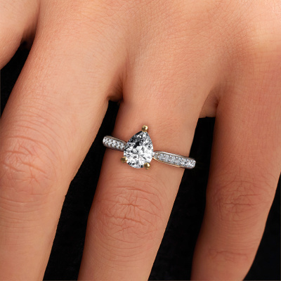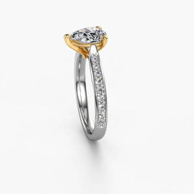 Bovenstaande verlovingsring heeft de naam Mignon PER 2. Dit type verlovingsring noemen we een pavé solitaire verlovingsring omdat hij een enkele middensteen heeft waarbij de banden van de verlovingsring ook volgezet zijn. De verlovingsring is uitgevoerd in de combinatie 14 Carat witgoud met goud en heeft als middensteen een peer diamant ter grootte van 1.50 crt en in de zijbanden zijn diamanten gezet. Ieder juweel wordt speciaal voor jou gemaakt door onze meester goudsmeden in ons eigen atelier.Deze trendy witgouden pavé solitaire verlovingsring heeft een schitterende peer diamant als centersteen, waarbij in de band nog meer diamanten zijn gezet om de middensteen nog meer te accentueren. Doordat de zetting van de pootjes om de diamant open is, vangt de diamant het licht van alle kanten op en schittert hierdoor optimaal. Hierboven kun je zien hoe onze goudsmid de verlovingsring heel precies tot in de kleinste details heeft bewerkt, zodat de wat hoger gelegen diamant een echte eyecatcher is. Wat een prachtige verlovingsring om te geven bij je aanzoek aan de liefde van jouw leven, aan jouw stralende middelpunt!Wellicht is het je opgevallen dat onze prijzen gemiddeld 30% lager liggen dan bij een andere juwelier. En dat terwijl de kwaliteit in de meeste gevallen nog beter is! Dit komt doordat onze goudsmeden je verlovingsring direct in ons eigen atelier vervaardigen. Hierdoor hoeven we geen dure voorraden te hanteren en kunnen we ieder gewenst detail direct op jouw verlovingsring aanbrengen.Ons team is iedere dag weer bezig om nieuwe ontwerpen toe te voegen, in samenwerking met onze designers en goudsmeden wordt gekeken hoe we tot het mooiste ontwerp kunnen komen. Wij doen ons best om tot een zo gevarieerd mogelijk aanbod te komen. Wellicht heb je zelf al een mooi idee van een sieraad dat je ooit wel eens gezien hebt. Neem dan eens vrijblijvend contact met ons op. Wij maken een offerte voor je op waarbij wij vrij zeker zijn dat we wat betreft kwaliteit en prijs jou versteld zullen laten staan.Om het voor jou makkelijker te maken kun je ieder besteld sieraad binnen 30 dagen na aflevering eenvoudig weer retour sturen.