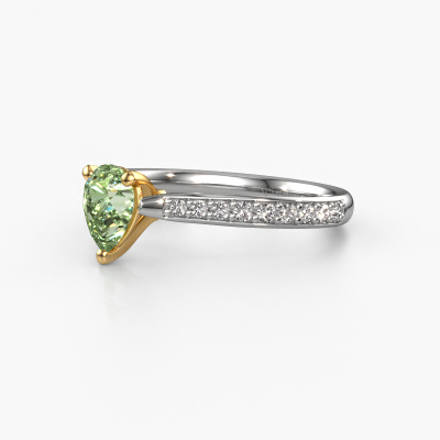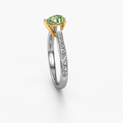 Bovenstaande verlovingsring heeft de naam Mignon per 2. Dit type verlovingsring noemen we een pavé solitaire verlovingsring omdat hij een enkele middensteen heeft waarbij de banden van de verlovingsring ook volgezet zijn. De verlovingsring is uitgevoerd in de combinatie 14 Carat witgoud met goud en heeft als middensteen een peer groene lab grown diamant ter grootte van 6.5x4.5 mm en in de zijbanden zijn diamanten gezet. Ieder juweel wordt speciaal voor jou gemaakt door onze meester goudsmeden in ons eigen atelier.Deze trendy witgouden pavé solitaire verlovingsring heeft een schitterende peer groene lab grown diamant als centersteen, waarbij in de band nog meer groene lab grown diamanten zijn gezet om de middensteen nog meer te accentueren. Doordat de zetting van de pootjes om de groene lab grown diamant open is, vangt de groene lab grown diamant het licht van alle kanten op en schittert hierdoor optimaal. Hierboven kun je zien hoe onze goudsmid de verlovingsring heel precies tot in de kleinste details heeft bewerkt, zodat de wat hoger gelegen groene lab grown diamant een echte eyecatcher is. Wat een prachtige verlovingsring om te geven bij je aanzoek aan de liefde van jouw leven, aan jouw stralende middelpunt!Wellicht is het je opgevallen dat onze prijzen gemiddeld 30% lager liggen dan bij een andere juwelier. En dat terwijl de kwaliteit in de meeste gevallen nog beter is! Dit komt doordat onze goudsmeden je verlovingsring direct in ons eigen atelier vervaardigen. Hierdoor hoeven we geen dure voorraden te hanteren en kunnen we ieder gewenst detail direct op jouw verlovingsring aanbrengen.Ons team is iedere dag weer bezig om nieuwe ontwerpen toe te voegen, in samenwerking met onze designers en goudsmeden wordt gekeken hoe we tot het mooiste ontwerp kunnen komen. Wij doen ons best om tot een zo gevarieerd mogelijk aanbod te komen. Wellicht heb je zelf al een mooi idee van een sieraad dat je ooit wel eens gezien hebt. Neem dan eens vrijblijvend contact met ons op. Wij maken een offerte voor je op waarbij wij vrij zeker zijn dat we wat betreft kwaliteit en prijs jou versteld zullen laten staan.Om het voor jou makkelijker te maken kun je ieder besteld sieraad binnen 30 dagen na aflevering eenvoudig weer retour sturen.