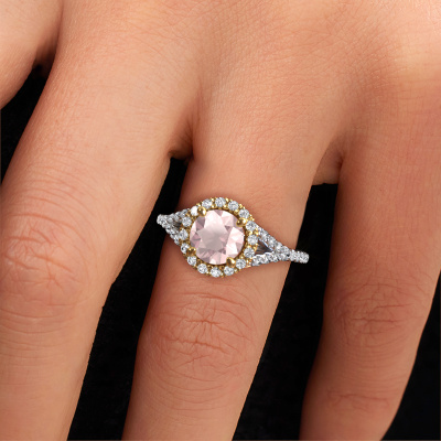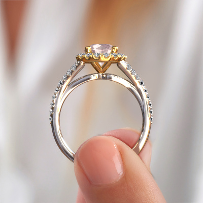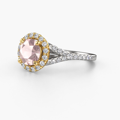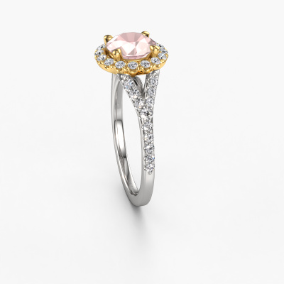 Bovenstaande verlovingsring heeft de naam Kimber RND. Dit type verlovingsring noemen we een pavé solitaire verlovingsring omdat hij een enkele middensteen heeft waarbij de banden van de verlovingsring ook volgezet zijn. De verlovingsring is uitgevoerd in de combinatie 14 Carat witgoud met goud en heeft als middensteen een ronde morganiet champagne ter grootte van 7 mm en in de zijbanden zijn lab-grown diamanten gezet. Ieder juweel is gemaakt om aan je vinger te stralen, ieder sieraad wordt met liefde door onze goudsmeden met de hand gemaakt.Deze klassieke witgouden pavé solitaire verlovingsring heeft een schitterende ronde morganiet champagne als centersteen, waarbij in de band nog meer morganiet champagne zijn gezet om de middensteen nog meer te accentueren. Doordat de zetting van de pootjes om de morganiet champagne open is, vangt de morganiet champagne het licht van alle kanten op en schittert hierdoor optimaal. Hierboven kun je zien hoe onze goudsmid de verlovingsring heel precies tot in de kleinste details heeft bewerkt, zodat de wat hoger gelegen morganiet champagne een echte eyecatcher is. Wat een prachtige verlovingsring om te geven bij je aanzoek aan de liefde van jouw leven, aan jouw stralende middelpunt!Wist je dat we een beste prijs garantie geven voor jouw verlovingsring? Dit is mogelijk omdat al onze sieraden met de hand gemaakt worden in ons eigen atelier. We hebben geen dure voorraden, en we maken pas je verlovingsring op het moment dat je besteld hebt. Doordat we de hele productie zelf in de hand hebben, kunnen wij je goed informeren over alle eigenschappen van deze ring. Juist omdat het kopen van een verlovingsring online spannend is, begrijpen wij dat het fijn is om alle kenmerken te weten van jouw ring.Ons team is iedere dag weer bezig om nieuwe ontwerpen toe te voegen, in samenwerking met onze designers en goudsmeden wordt gekeken hoe we tot het mooiste ontwerp kunnen komen. Wij doen ons best om tot een zo gevarieerd mogelijk aanbod te komen. Wellicht heb je zelf al een mooi idee van een sieraad dat je ooit wel eens gezien hebt. Neem dan eens vrijblijvend contact met ons op. Wij maken een offerte voor je op waarbij wij vrij zeker zijn dat we wat betreft kwaliteit en prijs jou versteld zullen laten staan.Om het voor jou makkelijker te maken kun je ieder besteld sieraad binnen 30 dagen na aflevering eenvoudig weer retour sturen.
