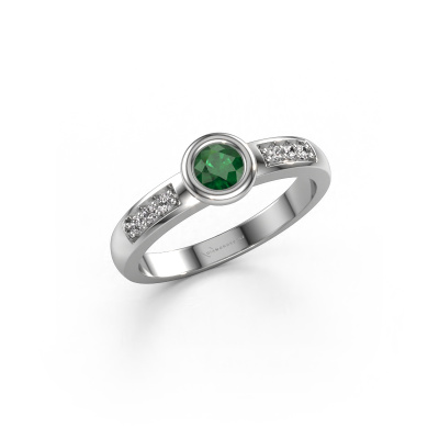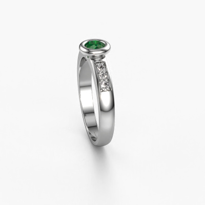 Bovenstaande verlovingsring heeft de naam Lieke. Dit type verlovingsring noemen we een pavé solitaire verlovingsring omdat hij een enkele middensteen heeft waarbij de banden van de verlovingsring ook volgezet zijn. De verlovingsring is uitgevoerd in de combinatie 14 Carat witgoud met witgoud en heeft als middensteen een ronde smaragd ter grootte van 4 mm en in de zijbanden zijn diamanten gezet. Ieder juweel is uniek, doordat je deze ring geheel naar eigen wensen kunt samenstellen.Deze klassieke witgouden pavé solitaire verlovingsring heeft een schitterende ronde smaragd als centersteen, waarbij in de band nog meer smaragd zijn gezet om de middensteen nog meer te accentueren. Doordat de zetting van de pootjes om de smaragd open is, vangt de smaragd het licht van alle kanten op en schittert hierdoor optimaal. Hierboven kun je zien hoe onze goudsmid de verlovingsring heel precies tot in de kleinste details heeft bewerkt, zodat de wat hoger gelegen smaragd een echte eyecatcher is. Wat een prachtige verlovingsring om te geven bij je aanzoek aan de liefde van jouw leven, aan jouw stralende middelpunt!Door het gebruik van de modernste technieken, gecombineerd met ambachtelijk vakmanschap kunnen wij alle verlovingsringen zelf in ons atelier maken. Ieder sieraad wordt pas gemaakt nadat deze besteld is. Dit heeft als bijkomend voordeel dat we kunnen leveren tegen een prijs die je nergens anders tegenkomt.Ons team ontwerpt dagelijks nieuwe ringen in diverse stijlen. Heb je zelf een pavé solitaire verlovingsring ergens gezien, die jij het liefst aan jouw geliefde zou willen geven? Je kunt altijd jouw ideeën en ontwerp met onze sieradenontwerpers bespreken, want wij zetten graag jouw ontwerp om tot een klassieke verlovingsring. Je kunt tijdens het ontwerpproces steeds meekijken, omdat het ontwerp in een zeer gedetailleerde 3D tekening wordt omgezet. Daarbij kun je een dummy bestellen van het uiteindelijke ontwerp. Een dummy is een kunststof ring, die precies dezelfde vormen heeft als jouw uiteindelijke ontwerp. Je kunt deze passen en zien of de ontworpen verlovingsring helemaal naar jouw wens is. Wij sturen je graag een vrijblijvende offerte, waarbij je ongetwijfeld versteld zult staan over de prijs en de kwaliteit van de ring en edelstenen.Om het voor jou makkelijker te maken kun je ieder besteld sieraad binnen 30 dagen na aflevering eenvoudig weer retour sturen.