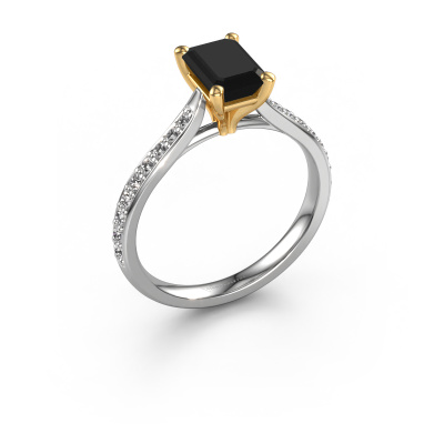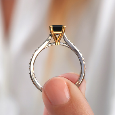 Bovenstaande verlovingsring heeft de naam Mignon eme 2. Dit type verlovingsring noemen we een pavé solitaire verlovingsring omdat hij een enkele middensteen heeft waarbij de banden van de verlovingsring ook volgezet zijn. De verlovingsring is uitgevoerd in de combinatie 14 Carat witgoud met goud en heeft als middensteen een smaragd geslepen zwarte diamant ter grootte van 1.380 crt en in de zijbanden zijn lab-grown diamanten gezet. Ieder juweel is speciaal voor jou gemaakt, met aandacht voor detail en design.Deze exclusieve witgouden pavé solitaire verlovingsring heeft een schitterende smaragd geslepen zwarte diamant als centersteen, waarbij in de band nog meer zwarte diamanten zijn gezet om de middensteen nog meer te accentueren. Doordat de zetting van de pootjes om de zwarte diamant open is, vangt de zwarte diamant het licht van alle kanten op en schittert hierdoor optimaal. Hierboven kun je zien hoe onze goudsmid de verlovingsring heel precies tot in de kleinste details heeft bewerkt, zodat de wat hoger gelegen zwarte diamant een echte eyecatcher is. Wat een prachtige verlovingsring om te geven bij je aanzoek aan de liefde van jouw leven, aan jouw stralende middelpunt!Wellicht is het je opgevallen dat onze prijzen gemiddeld 30% lager liggen dan bij een andere juwelier. En dat terwijl de kwaliteit in de meeste gevallen nog beter is! Dit komt doordat onze goudsmeden je verlovingsring direct in ons eigen atelier vervaardigen. Hierdoor hoeven we geen dure voorraden te hanteren en kunnen we ieder gewenst detail direct op jouw verlovingsring aanbrengen.Heb je zelf een speciale ring in gedachten, die je wellicht ergens gezien hebt? Je kunt je ideeën altijd met ons bespreken, wij zetten graag jouw ontwerp om tot een unieke verlovingsring. Het ontwerp kun je volgen, omdat wij met 3D tekeningen werken. Hierdoor krijg je al een realistische indruk van hoe jouw ontwerp er in het echt uit komt te zien. Wij sturen je graag een vrijblijvende offerte, waarbij je ongetwijfeld verwonderd zult zijn over de prijs in combinatie met de uitstekende kwaliteit die we aanbieden.Om het voor jou makkelijker te maken kun je ieder besteld sieraad binnen 30 dagen na aflevering eenvoudig weer retour sturen.