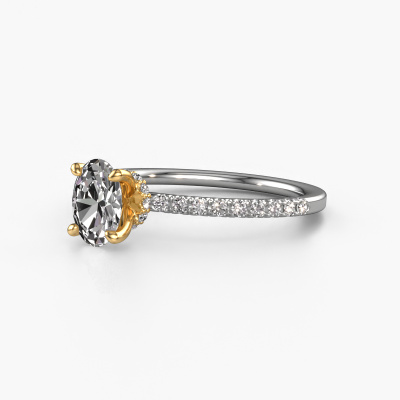 Bovenstaande verlovingsring heeft de naam Crystal OVL 4. Dit type verlovingsring noemen we een pavé solitaire verlovingsring omdat hij een enkele middensteen heeft waarbij de banden van de verlovingsring ook volgezet zijn. De verlovingsring is uitgevoerd in de combinatie 14 Carat witgoud met goud en heeft als middensteen een ovale zirkonia ter grootte van 7x5 mm en in de zijbanden zijn diamanten gezet. Ieder juweel wordt met passie en liefde gemaakt door één van onze meestergoudsmeden.Deze eigentijdse witgouden pavé solitaire verlovingsring heeft een schitterende ovale zirkonia als centersteen, waarbij in de band nog meer zirkonia's zijn gezet om de middensteen nog meer te accentueren. Doordat de zetting van de pootjes om de zirkonia open is, vangt de zirkonia het licht van alle kanten op en schittert hierdoor optimaal. Hierboven kun je zien hoe onze goudsmid de verlovingsring heel precies tot in de kleinste details heeft bewerkt, zodat de wat hoger gelegen zirkonia een echte eyecatcher is. Wat een prachtige verlovingsring om te geven bij je aanzoek aan de liefde van jouw leven, aan jouw stralende middelpunt!Wist je dat we een beste prijs garantie geven voor jouw verlovingsring? Dit is mogelijk omdat al onze sieraden met de hand gemaakt worden in ons eigen atelier. We hebben geen dure voorraden, en we maken pas je verlovingsring op het moment dat je besteld hebt. Doordat we de hele productie zelf in de hand hebben, kunnen wij je goed informeren over alle eigenschappen van deze ring. Juist omdat het kopen van een verlovingsring online spannend is, begrijpen wij dat het fijn is om alle kenmerken te weten van jouw ring.Ons team is iedere dag weer bezig om nieuwe ontwerpen toe te voegen, in samenwerking met onze designers en goudsmeden wordt gekeken hoe we tot het mooiste ontwerp kunnen komen. Wij doen ons best om tot een zo gevarieerd mogelijk aanbod te komen. Wellicht heb je zelf al een mooi idee van een sieraad dat je ooit wel eens gezien hebt. Neem dan eens vrijblijvend contact met ons op. Wij maken een offerte voor je op waarbij wij vrij zeker zijn dat we wat betreft kwaliteit en prijs jou versteld zullen laten staan.Om het voor jou makkelijker te maken kun je ieder besteld sieraad binnen 30 dagen na aflevering eenvoudig weer retour sturen.