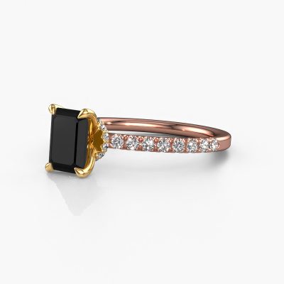 Bovenstaande verlovingsring heeft de naam Crystal EME 4. Dit type verlovingsring noemen we een pavé solitaire verlovingsring omdat hij een enkele middensteen heeft waarbij de banden van de verlovingsring ook volgezet zijn. De verlovingsring is uitgevoerd in de combinatie 14 Carat rosé goud met goud en heeft als middensteen een smaragd geslepen zwarte diamant ter grootte van 1.380 crt en in de zijbanden zijn lab-grown diamanten gezet. Ieder juweel is gemaakt om aan je vinger te stralen, ieder sieraad wordt met liefde door onze goudsmeden met de hand gemaakt.Deze modieuze rosé gouden pavé solitaire verlovingsring heeft een schitterende smaragd geslepen zwarte diamant als centersteen, waarbij in de band nog meer zwarte diamanten zijn gezet om de middensteen nog meer te accentueren. Doordat de zetting van de pootjes om de zwarte diamant open is, vangt de zwarte diamant het licht van alle kanten op en schittert hierdoor optimaal. Hierboven kun je zien hoe onze goudsmid de verlovingsring heel precies tot in de kleinste details heeft bewerkt, zodat de wat hoger gelegen zwarte diamant een echte eyecatcher is. Wat een prachtige verlovingsring om te geven bij je aanzoek aan de liefde van jouw leven, aan jouw stralende middelpunt!Wist je dat we een beste prijs garantie geven voor jouw verlovingsring? Dit is mogelijk omdat al onze sieraden met de hand gemaakt worden in ons eigen atelier. We hebben geen dure voorraden, en we maken pas je verlovingsring op het moment dat je besteld hebt. Doordat we de hele productie zelf in de hand hebben, kunnen wij je goed informeren over alle eigenschappen van deze ring. Juist omdat het kopen van een verlovingsring online spannend is, begrijpen wij dat het fijn is om alle kenmerken te weten van jouw ring.Ons team is iedere dag weer bezig om nieuwe ontwerpen toe te voegen, in samenwerking met onze designers en goudsmeden wordt gekeken hoe we tot het mooiste ontwerp kunnen komen. Wij doen ons best om tot een zo gevarieerd mogelijk aanbod te komen. Wellicht heb je zelf al een mooi idee van een sieraad dat je ooit wel eens gezien hebt. Neem dan eens vrijblijvend contact met ons op. Wij maken een offerte voor je op waarbij wij vrij zeker zijn dat we wat betreft kwaliteit en prijs jou versteld zullen laten staan.Om het voor jou makkelijker te maken kun je ieder besteld sieraad binnen 30 dagen na aflevering eenvoudig weer retour sturen.