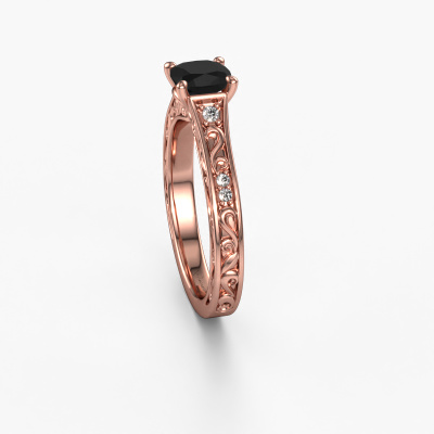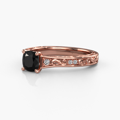 Bovenstaande verlovingsring heeft de naam Mallory cus. Dit type verlovingsring noemen we een pavé solitaire verlovingsring omdat hij een enkele middensteen heeft waarbij de banden van de verlovingsring ook volgezet zijn. Deze verlovingsring is uitgevoerd in 14 Carat rosé goud en heeft als middensteen een cushion zwarte diamant ter grootte van 1.15 crt, en in de zijbanden zijn diamanten gezet. Ieder juweel wordt speciaal voor jou gemaakt door onze meester goudsmeden in ons eigen atelier.. Deze Keltische rosé gouden pavé solitaire verlovingsring heeft een schitterende cushion zwarte diamant als center steen, waarbij in de band nog meer diamanten zijn gezet om de middensteen nog meer te accentueren. Doordat de zetting van de pootjes om de zwarte diamant open is, vangt de zwarte diamant het licht van alle kanten op en schittert hierdoor optimaal. Hierboven kun je zien hoe onze goudsmid de verlovingsring heel precies tot in de kleinste details heeft bewerkt, zodat de wat hoger gelegen zwarte diamant een echte eyecatcher is. Wat een prachtige verlovingsring om te geven bij je aanzoek aan de liefde van jouw leven, aan jouw stralende middelpunt!Door onze modernste technieken kunnen wij met uiterste precisie prachtige sieraden te ontwerpen en voor jou personaliseren in de hoogste juwelierskwaliteit. Tegelijkertijd zijn onze verlovingsringen altijd 30% goedkoper dan bij een andere juwelier. Dit komt doordat alle verlovingsringen pas vervaardigd worden op het moment dat deze besteld wordt en we daardoor geen dure voorraden hoeven te hanteren. Mocht je aan een bepaald budget gebonden zijn, kunnen we je graag adviseren welke combinatie je het beste kunt kiezen.Ons team ontwerpt dagelijks nieuwe ringen in diverse stijlen. Heb je zelf een pavé solitaire verlovingsring ergens gezien, die jij het liefst aan jouw geliefde zou willen geven? Je kunt altijd jouw ideeën en ontwerp met onze sieradenontwerpers bespreken, want wij zetten graag jouw ontwerp om tot een Keltische verlovingsring. Je kunt tijdens het ontwerpproces steeds meekijken, omdat het ontwerp in een zeer gedetailleerde 3D tekening wordt omgezet. Daarbij kun je een dummy bestellen van het uiteindelijke ontwerp. Een dummy is een kunststof ring, die precies dezelfde vormen heeft als jouw uiteindelijke ontwerp. Je kunt deze passen en zien of de ontworpen verlovingsring helemaal naar jouw wens is. Wij sturen je graag een vrijblijvende offerte, waarbij je ongetwijfeld versteld zult staan over de prijs en de kwaliteit van de ring en edelstenen.Om het voor jou makkelijker te maken kun je ieder besteld sieraad binnen 30 dagen na aflevering eenvoudig weer retour sturen.